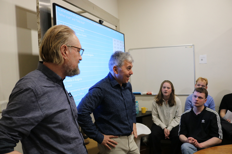 Още от самото начало студентите зададоха посоката на разговорите, поставяйки ключови въпроси, които отразяват както академичния им интерес, така и внимателното им наблюдение върху случващото се в България. Сред водещите теми, които те повдигнаха, беше геополитическата ориентация на България. Дискусиите се фокусираха върху напрежението между проевропейските и евроскептичните нагласи в обществото и дали тази линия на разделение се задълбочава или постепенно се преодолява.